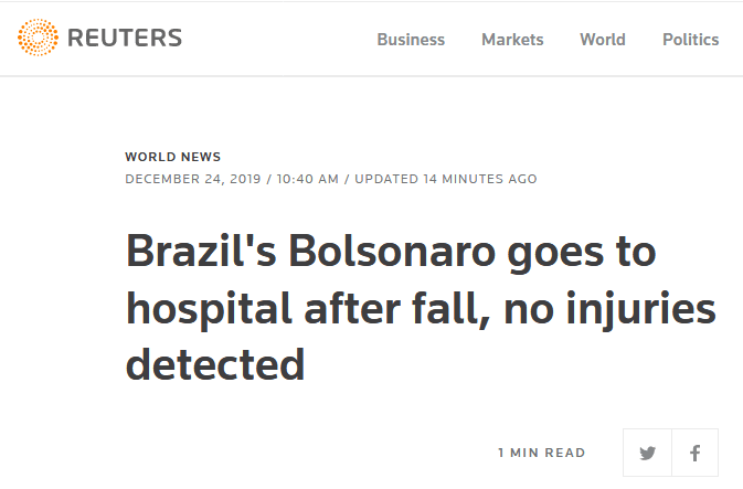[环球网报道 记者 温家越]据路透社最新报道,巴西总统办公室在一份声明中表示,当地时间23日,巴西总统博索纳罗在首都巴西利亚的总统官邸摔倒,随后被送往医院进行扫描检查。报道称,没有发现受伤。