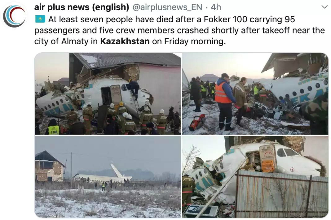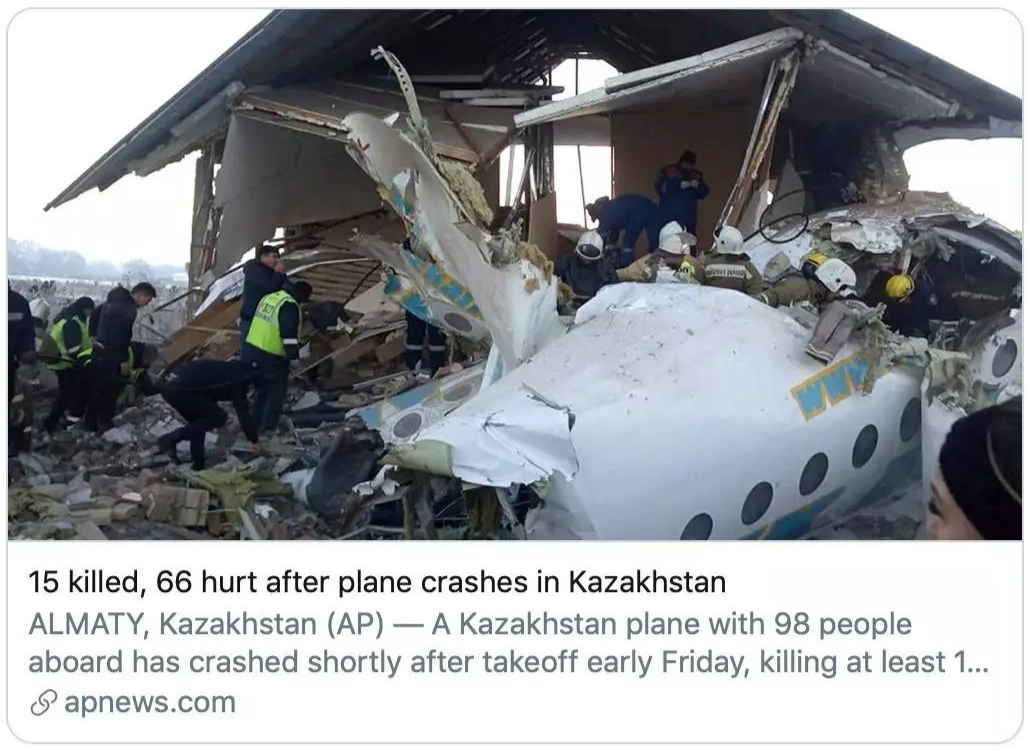 当地时间7时22分左右,哈萨克斯坦贝克航空公司(Bek Air)一航班从阿拉木图机场起飞前往哈萨克斯坦首都努尔苏丹,但在起飞不久后出现故障并下坠,最终撞上一栋两层高的楼。现场并未起火,搜救人员正在紧急救援中。目前失事原因暂不清楚。