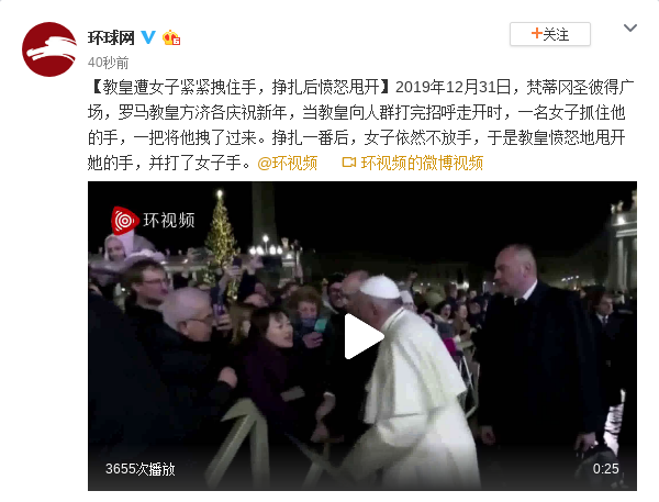 2019年12月31日,梵蒂冈圣彼得广场,罗马教皇方济各庆祝新年,当教皇向人群打完招呼走开时,一名女子抓住他的手,一把将他拽了过来。挣扎一番后,女子依然不放手,于是教皇愤怒地甩开她的手,并打了女子手。