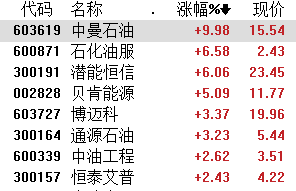 A股油气板块走强,中曼石油涨停,石化油服涨逾6%,此前一度逼近涨停,潜能恒信、贝肯能源、博迈科等其余多股均有不同程度的拉升。
