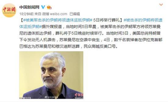 原标题:被美军击杀的伊朗将领遗体运抵伊朗 5日将举行葬礼