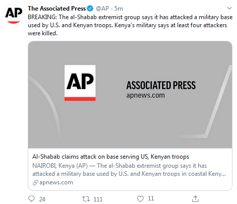 原标题:快讯!肯尼亚一美军用军事基地遇袭,至少4名袭击者被杀