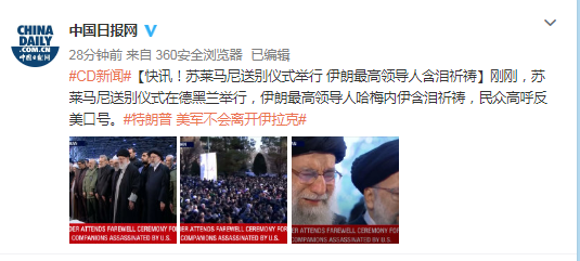 原标题:快讯!苏莱马尼送别仪式举行 伊朗最高领导人含泪祈祷