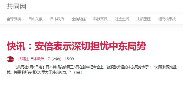 [环球网快讯]据日本共同社刚刚消息,日本首相安倍晋三6日在新年记者会上,就紧张升温的中东局势表态:“对现状深切担忧。将要求所有相关方尽力于外交努力。”