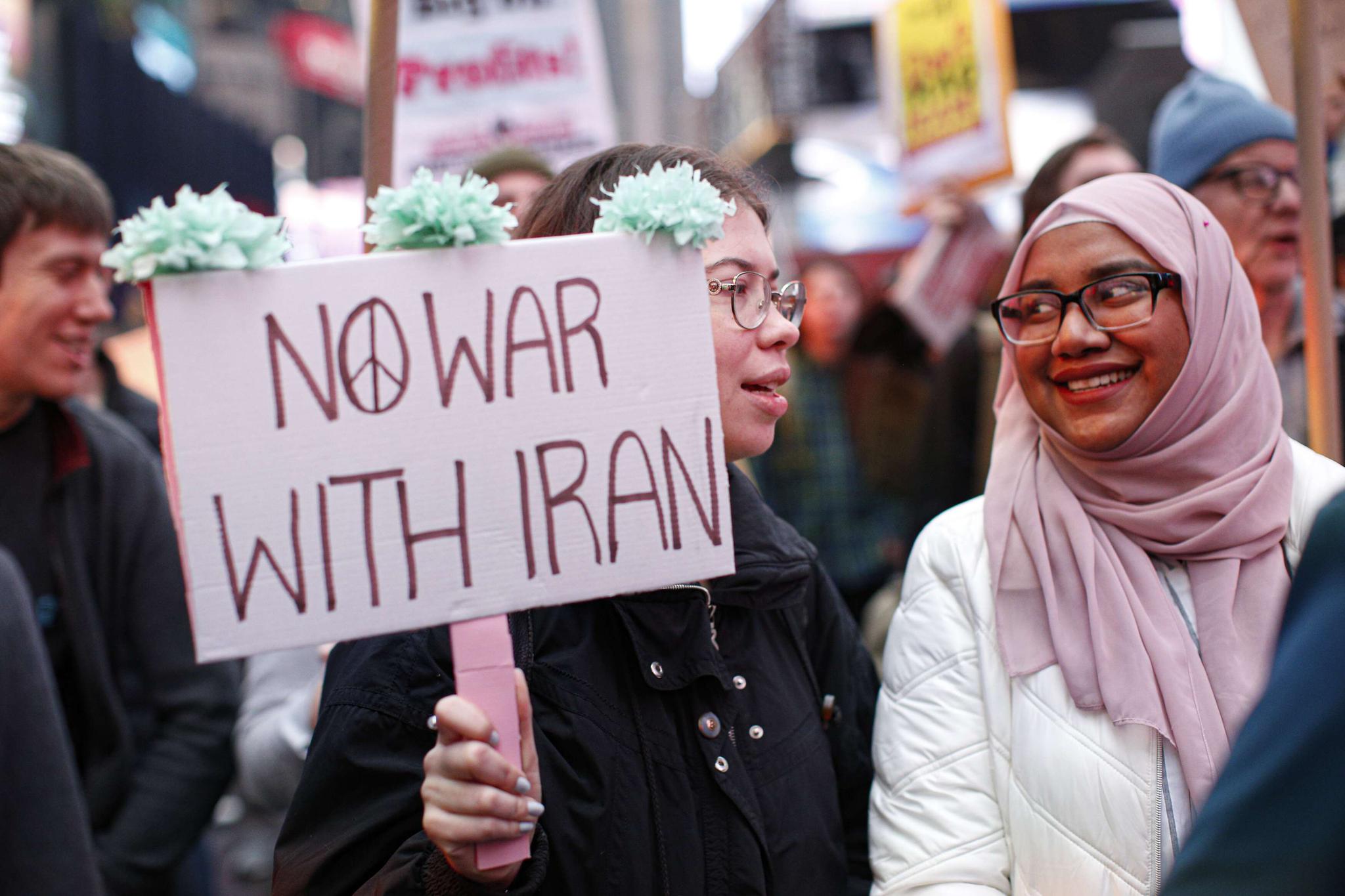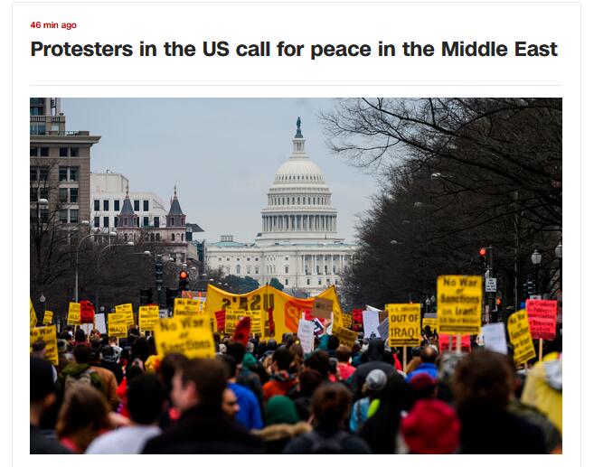 据CNN报道,在华盛顿,许多人在白宫以及特朗普国际酒店外示威,有人举着“美国撤出伊拉克”“不与伊朗开战”等标语。在纽约,一些抗议者聚集在时代广场。“把收我们的税用于学校,而非战争。”一张抗议者举着的牌子上写有这样的话。此外,还有一些人在脸上涂着象征和平的标志,举着谴责美帝国主义的海报。