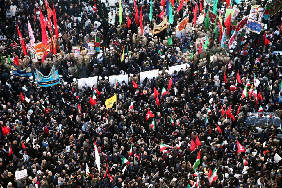 当地时间1月6日,在伊朗首都德黑兰,上万名伊朗民众参加苏莱马尼的葬礼(路透社)