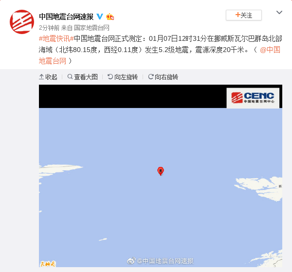 中国地震台网正式测定:01月07日12时31分在挪威斯瓦尔巴群岛北部海域(北纬80.15度,西经0.11度)发生5.2级地震,震源深度20千米。( @中国地震台网 )