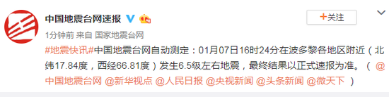 中国地震台网自动测定:01月07日16时24分在波多黎各地区附近(北纬17.84度,西经66.81度)发生6.5级左右地震,最终结果以正式速报为准。