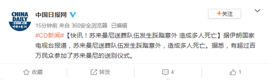 据伊朗国家电视台报道,苏来曼尼送葬队伍发生踩踏意外,造成多人死亡。据悉,有超过百万民众参加了苏来曼尼的送别仪式。