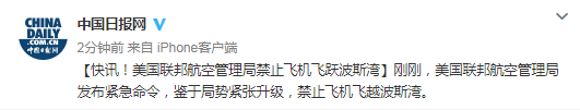 原标题:快讯!美国联邦航空管理局禁止飞机飞越波斯湾