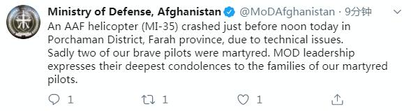 海外网1月8日电 阿富汗国防部推特8日称,阿富汗一架米-35直升机因技术问题坠毁,两名飞行员遇难。