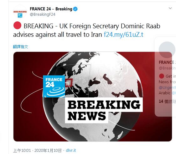 【环球网快讯】据法国24台刚刚消息,英国外交大臣拉布(Dominic Raab)发出通知,呼吁民众不要前往伊朗。