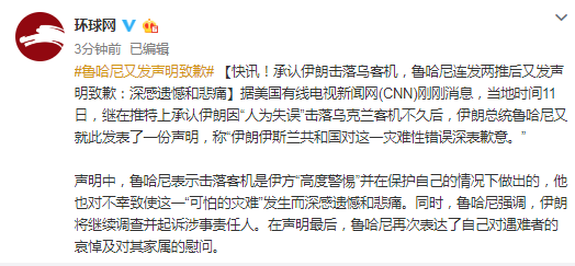 原标题:快讯!承认伊朗击落乌客机,鲁哈尼连发两推后又发声明致歉:深感遗憾和悲痛