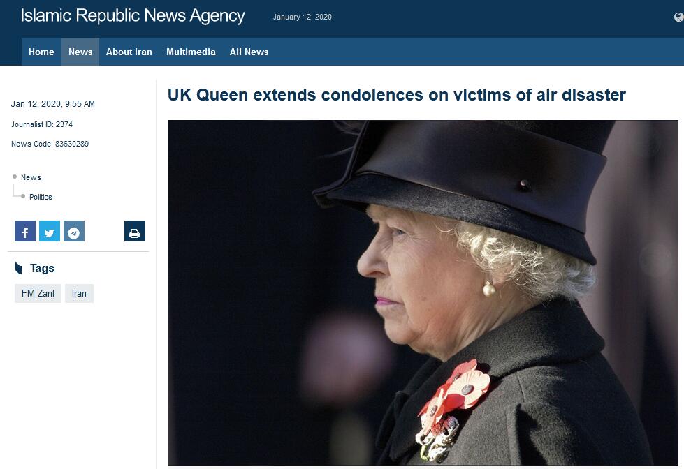 [环球网报道 记者 温家越]据伊朗伊斯兰共和国通讯社12日最新报道,英国女王伊丽莎白二世对乌克兰航空坠机遇难者表示哀悼。