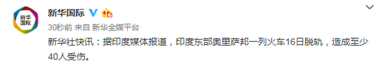 新华社快讯:据印度媒体报道,印度东部奥里萨邦一列火车16日脱轨,造成至少40人受伤。