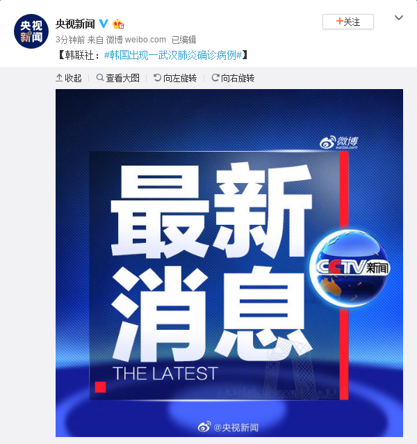 [韩联社:#韩国出现一武汉肺炎确诊病例#]