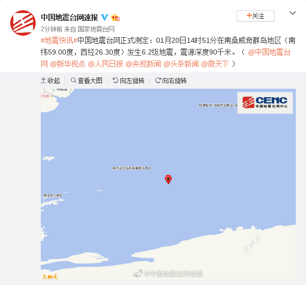 中国地震台网正式测定:01月20日14时51分在南桑威奇群岛地区(南纬59.00度,西经26.30度)发生6.2级地震,震源深度90千米。