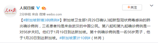 新加坡卫生部1月29日确认3起新型冠状病毒感染的肺炎确诊病例,三名患者均是来自武汉的中国公民。第八起和第九起确诊病例是一对56岁夫妇。他们于1月19日到达新加坡。第十例确诊病例是一名56岁男子,他于1月20日到达新加坡。
