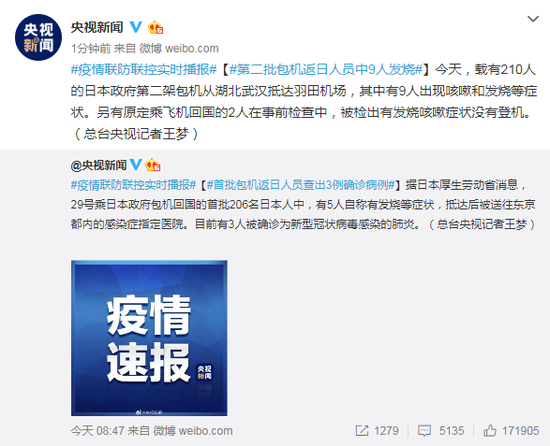 今天,载有210人的日本政府第二架包机从湖北武汉抵达羽田机场,其中有9人出现咳嗽和发烧等症状。另有原定乘飞机回国的2人在事前检查中,被检出有发烧咳嗽症状没有登机。(总台央视记者王梦)
