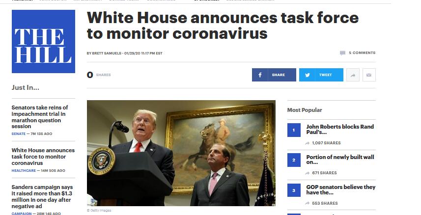 原标题:白宫成立应对新冠病毒特别小组,美卫生部长牵头
