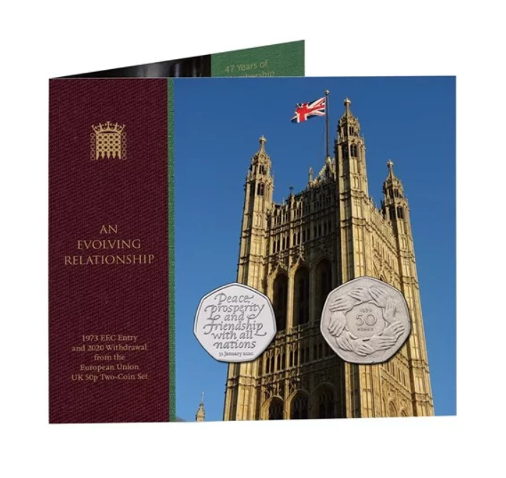 此外,售价为30英镑、生产了5000套的货币套装也已经售罄。这个套装内包含有两枚货币,分别是1973年英国加入欧洲经济共同体50便士纪念币和2020年英国脱欧50便士纪念币。