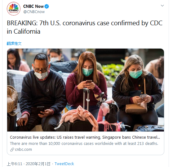 [环球网综合报道]据美国CNBC消息,美国加利福尼亚州圣克拉拉公共卫生局1月31日表示,一名成年男性的新型冠状病毒检测结果呈阳性,成为美国出现的至少第7例确诊病例。