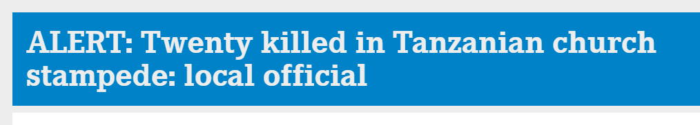 原标题:快讯!坦桑尼亚教堂发生踩踏事件,致20人死亡