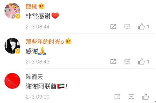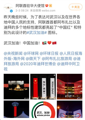 阿联酋多个地标性建筑支持中国抗疫的做法,也收到了中国网友的感谢。↓
