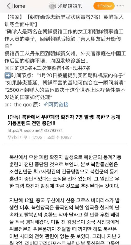 微博流传的消息截图而就在这一消息沸沸扬扬之际,为应对疫情,朝鲜国内在做什么?