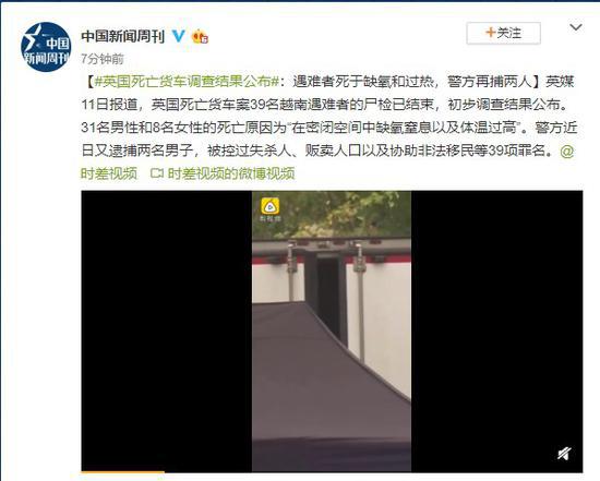英媒11日报道,英国死亡货车案39名越南遇难者的尸检已结束,初步调查结果公布。31名男性和8名女性的死亡原因为“在密闭空间中缺氧窒息以及体温过高”。警方近日又逮捕两名男子,被控过失杀人、贩卖人口以及协助非法移民等39项罪名。