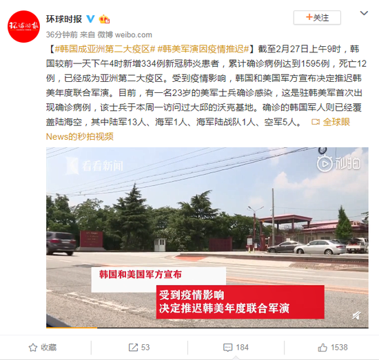 原标题:韩国成亚洲第二大疫区# #韩美军演因疫情推迟