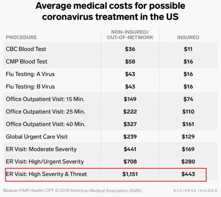 但核酸检测以外的常规项目,在美国医疗体系中需要收费。《商业内幕》曾介绍,重症且无医保患者若需要急诊治疗,最高可被收取1151美元。
