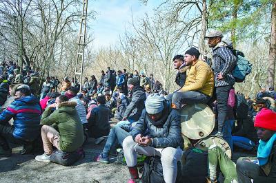 3月2日,在土耳其西北部的埃迪尔内省,非法移民等待通过边境进入欧洲。