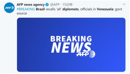 [环球网报道 记者 张晓雅]据法新社刚刚报道,巴西召回驻委内瑞拉所有外交官和外事官员。