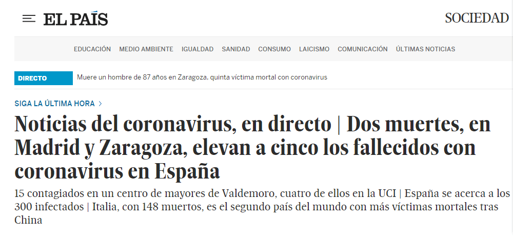 报道称,阿拉贡自治区政府证实,一名感染新冠肺炎的87岁男性在萨拉戈萨某医院去世。他是西班牙第5例新冠肺炎死亡病例。