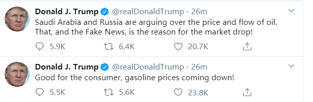 在前两个帖子中,特朗普先是表示之前被普遍认为导致股市下跌的沙特压低油价的事件,对消费者来说是件“好事”;之后他又说是沙特和俄罗斯在为了油价打架,还有假新闻的炒作,才是导致股市下跌的原因。