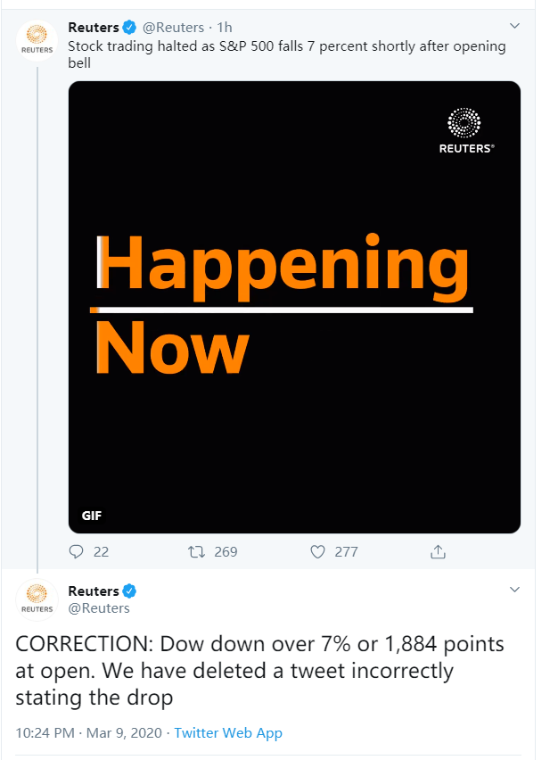 英国路透社也报道称,美国股市在3月9日开市后,其多个股指便立刻出现了7%的暴跌。