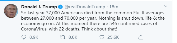 “所以去年3.7万美国人死于普通感冒。平均每年有2.7万到7万人。没有任何东西被关闭,生活和经济都在继续。此时此刻新冠病毒的确诊病例是546个,22个死亡。想想吧!”