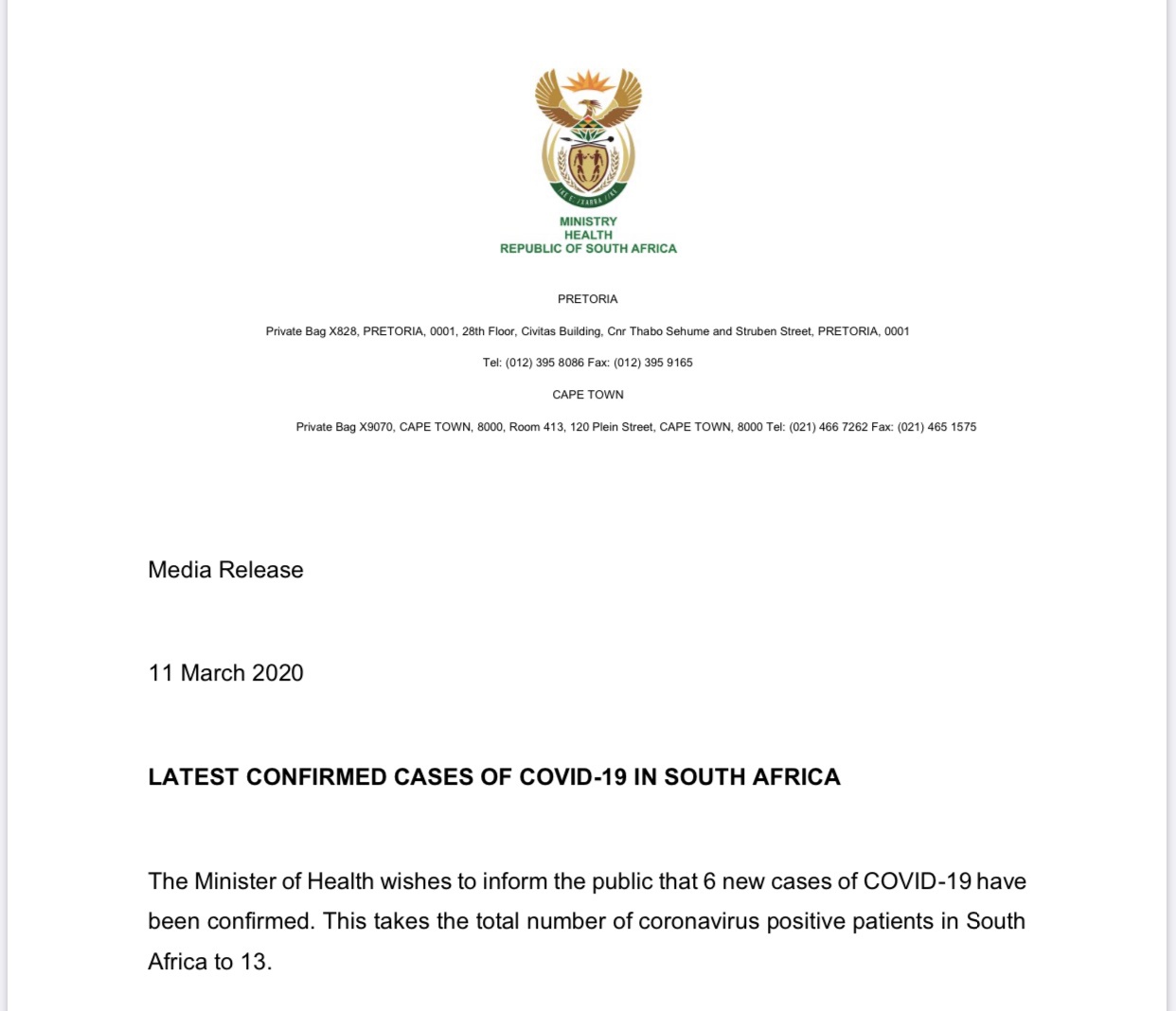 当地时间3月11日,南非卫生部官网发表声明通报了南非新增6例新冠肺炎确诊病例,目前南非累计确诊病例为13例。