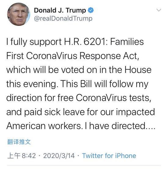 美国总统特朗普表示,非常支持《家庭优先新冠肺炎疫情应对法案》,这项法案将遵循他的指示,提供免费的新冠肺炎病毒检测,并为受影响的美国工人提供带薪病假。