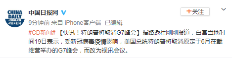 据路透社刚刚报道,白宫当地时间19日表示,受新冠病毒疫情影响,美国总统特朗普将取消原定于6月在戴维营举办的G7峰会,而改为视讯会议。