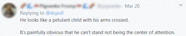 “他双臂交叉,就像个赌气的小孩。显然,他不能忍受他不是人群的焦点。”