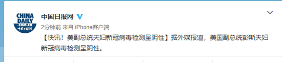 据外媒报道,美国副总统彭斯夫妇新冠病毒检测呈阴性。