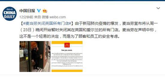 由于新冠肺炎疫情的爆发,麦当劳宣布将从周一(23日)晚间开始暂时关闭其在英国和爱尔兰的所有门店。麦当劳在声明中称,这不是一个轻易的决定,而是为了顾客和员工的安全考虑。