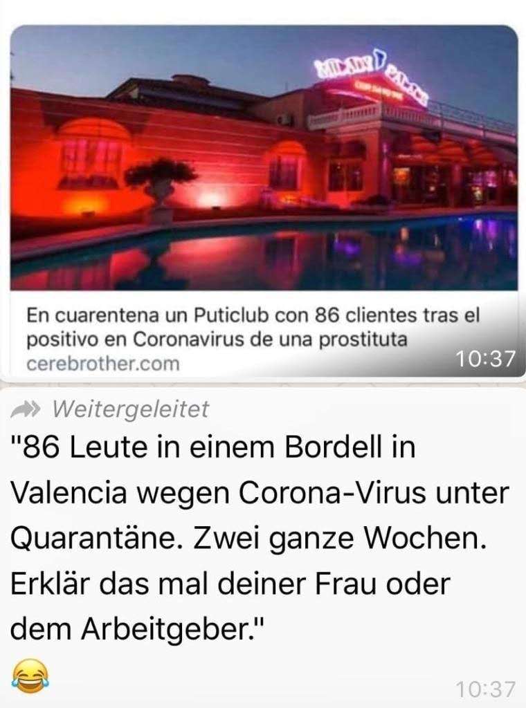 这在一张一望可知是个声色场所的图片下,配了两种语言,先是西班牙语,意为一名妓女检测呈阳性后86个嫖客被关在一家妓院里隔离,来源是cerebrother.com。而下面的德文除了重复西语信息之外,还透露妓院在瓦伦西亚,嫖客被隔离两周,最后说“向你的老婆或雇主解释去吧”。