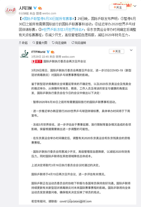 29日晚,国际乒联发布声明:①暂停6月30日之前所有需要国际旅行的国际乒联赛事和活动;②延迟举办2020世界乒乓球团体锦标赛;③世界乒联冻结3月世界排名;④东京奥运会举办时间确定后调整有关资格赛赛程;⑤减少开支,高级管理层自愿降薪,减轻2020年财务压力。