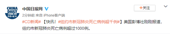美国彭博社刚刚报道,纽约市新冠肺炎死亡病例超过1000例。
