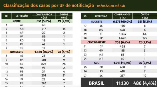 截至当地时间4月5日14时,巴西全国共确诊新冠肺炎病例11130例,比昨日新增852例,全国累计死亡病例486例,死亡率为4.4%。