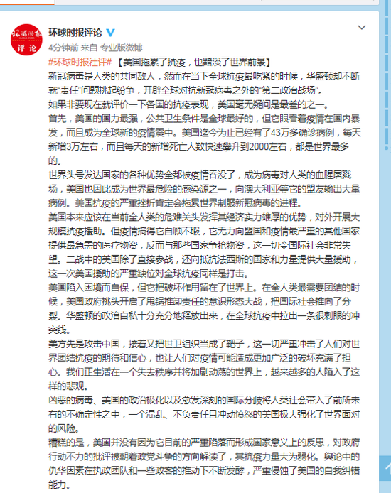 美国陷入困境而自保,但它把破坏作用留在了世界上。在全人类最需要团结的时候,美国政府挑头开启了甩锅推卸责任的意识形态大战,把国际社会推向了分裂。华盛顿的政治自私十分充分地释放出来,在全球抗疫中拉出一条很刺眼的冲突线。