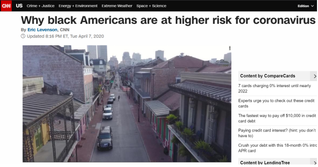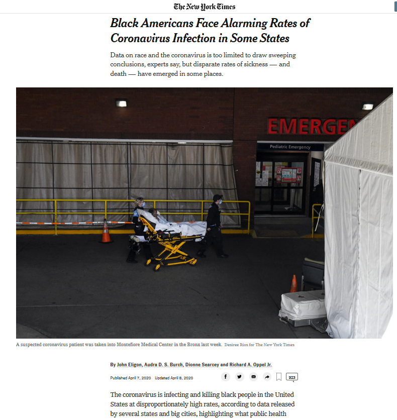 《纽约时报》认为,造成这一人口比例与患病率和致死率明显失衡的原因是美国社会“长期结构性不平等的结果”。分析认为,虽然美国联邦政府已经建议民众居家办公、防疫,超过一半以上州甚至颁布强制“居家令”,然而这对很多美国黑人群体来说,却看似一种遥不可及的“奢侈享受”。调查指出,很多黑人群体的工作、日常通勤,甚至住房和慢性病史等因素都使他们成为疫情之下的高危人群。